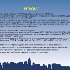 "Воронежстройреконструкция" - это одна из современных и крупных строительных компаний Центрально-Черноземного региона. Преимуществами нашей Компании перед конкурентами являются: Осуществление полного цикла работ (от разработки проекта до его полной реализации) Широкий спектр решаемых задач ( строительные, строительно-монтажные, пуско-наладочные работы, функции генерального подрядчика и технического заказчика) Высокотехнологичность (Инновационные технологии и новейшее оборудование) Профессионализм сотрудников (В Компании удалось собрать истинную команду профессионалов с большим опытом работы и объединенных одной целью) Приемлемые цены, высокое качество, короткие сроки выполнения работ. Инвестиционная деятельность (Компания инвестирует средства в новые проекты, помогает в кредитовании своих партнеров). Организация является крупной строительной компанией Воронежа - объём выполненных работ ежегодно увеличивается Индивидуальный подход к каждому клиенту (Благодаря собственному проектному институту имеется возможность учесть любое пожелание заказчика на любой стадии строительства) Надежность - строительная компания успешно реализовала все свои проекты в Воронеже, регионах России и многие из них раньше намеченных сроков На сегодняшний день ООО "Воронежстройреконструкция" является одной из самых стабильных, надежных и крупных строительных компаний Воронежа и Центрально-Чернозёмного региона.